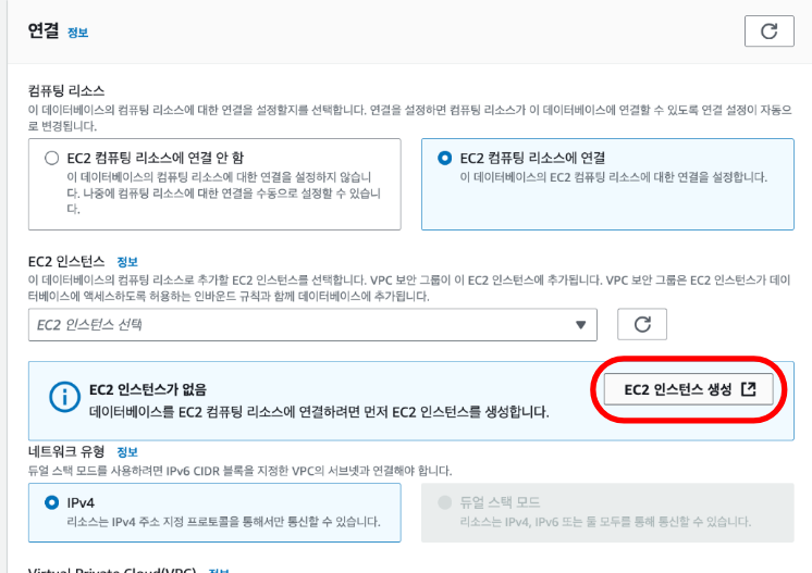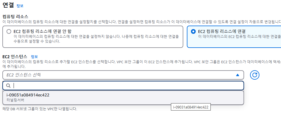 다시 데이터베이스 생성 페이지로 돌아와서 새로고침 버튼을 누르면 방금 생성한 EC2가 뜰 것이다.