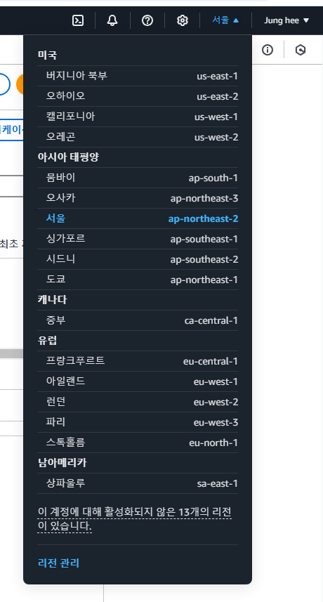 계정 로그인 후 free tier를 생성하기 전에 리전을 꼭 확인해준다.