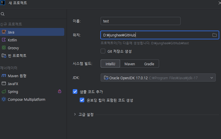 새 프로젝트 > 이름 :test > 위치 지정 하기 전에