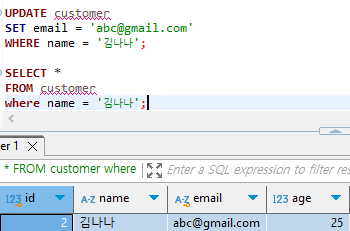 바꾸려는 사람이 누군지 찾아야되니까 where name = '김나나' 를 입력해주면 된다.