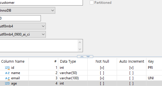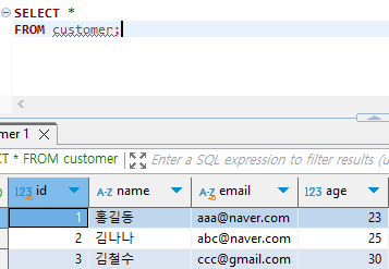 그 안에는 id, name, email,. age 컬럼을 생성해줬다.
