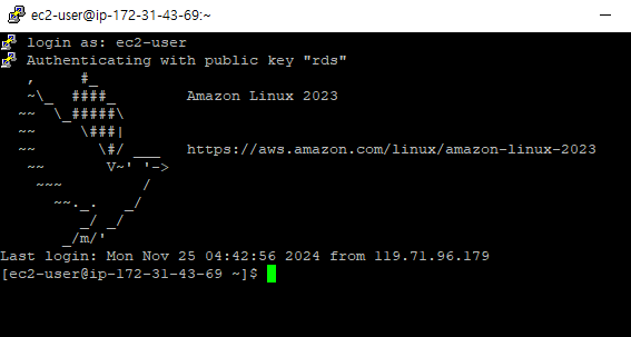 login as : 우리가 EC2를 생성하면서 설정한 이름