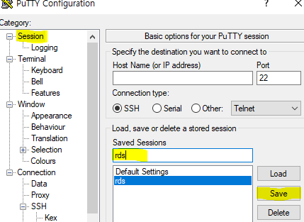 Session 으로 돌아가서 Saved Sessions 에 이름을 입력하고 Save를 해준다.