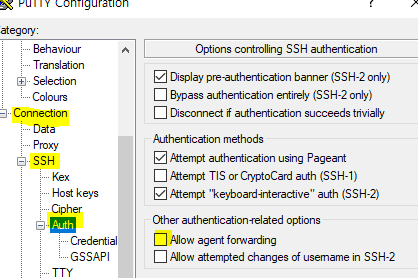 Connection > SSH > Auth 에서 Allow agent forwarding 에 체크해준다.