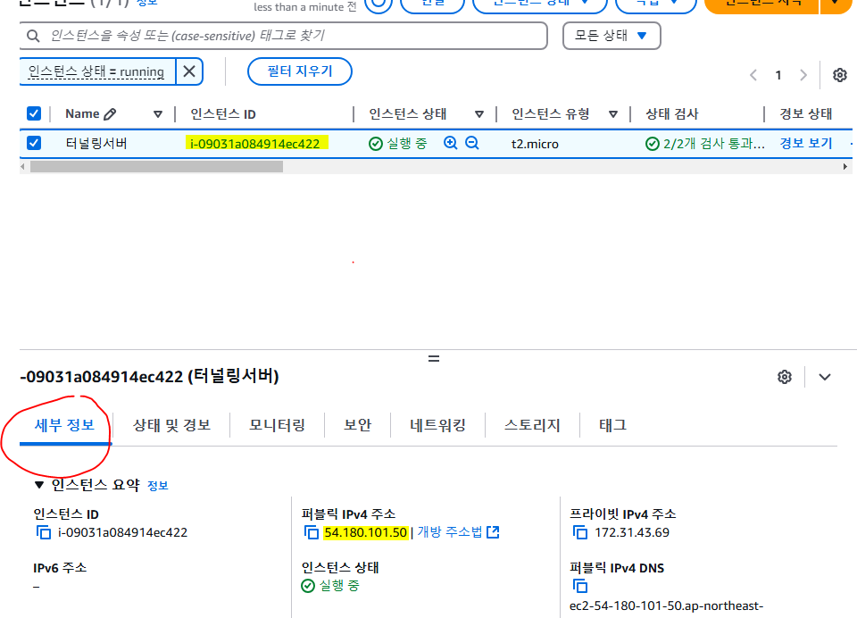 인스턴스ID 클릭하면 아래 세부정보가 나온다.