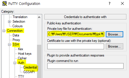 Private key file for authentication에서 EC2에 대한 ppk 파일을 선택한다.