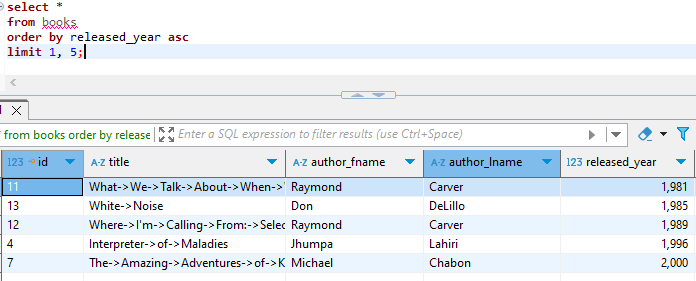 ● 출간년도가 제일 낮은순으로 정렬해서 5개만 가져오기