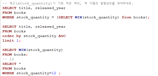 재고가 가장 적은 책의 책 이름과 발행년도를 조회할 수 있다.