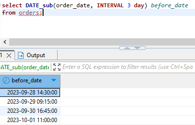 | 사용예제 : 3일 전의 날짜를 구하시오. -> date_sub(날짜, interval 3 day) |