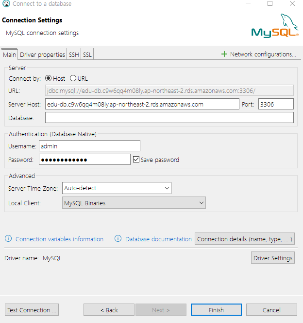 연결 테스트가 성공하면 Finish 버튼을 누르고 설정이 끝난다.