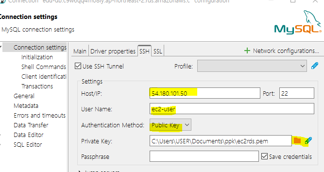 > 오른쪽에 파일 버튼 눌러서 pem 파일 경로 지정