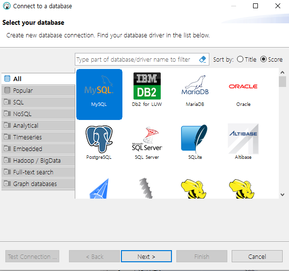 그럼 이런 창이 뜨는데 우리는 MySQL를 사용할거기 때문에 선택해주고 Next를 누른다.