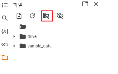 위 코드를 실행해서 연동할 수 있지만, 왼쪽 파일 탭을 클릭하여 드라이브 마운트를 클릭해서 연동할 수도 있습니다.