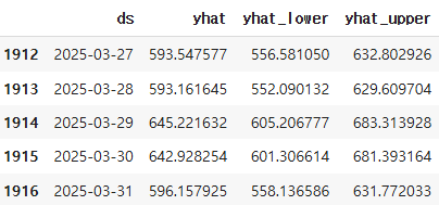 forecast[['ds', 'yhat', 'yhat_lower', 'yhat_upper']].tail())