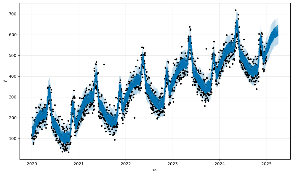 Prophet은 예측 결과를 쉽게 시각화할 수 있는 내장 함수를 제공합니다.