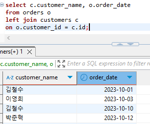 - orders 테이블에서 customers 테이블과 연결
