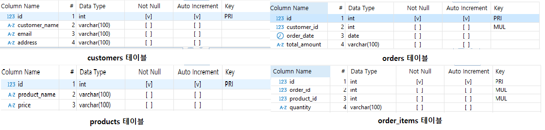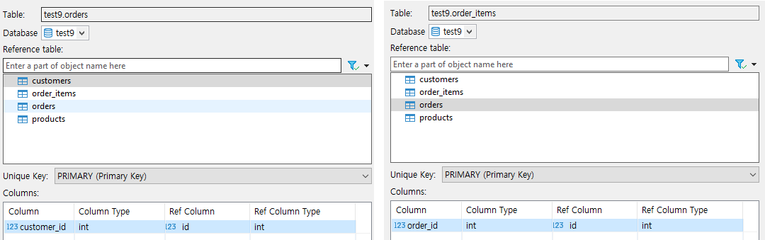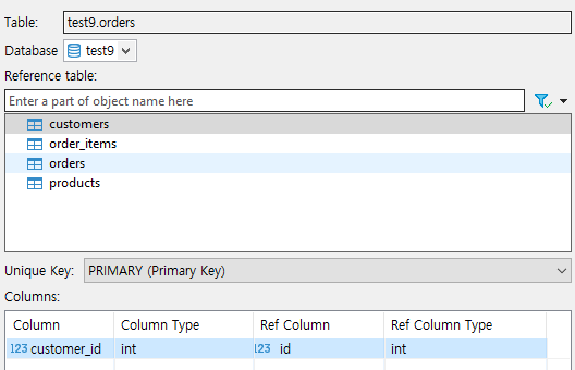 orders테이블과 orders_items 테이블에 id가 아닌 customer_id, order_id, product_id 컬럼이 있죠?