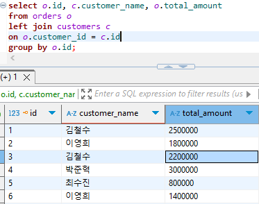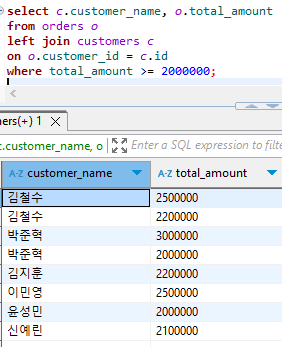 6. 총액(total_amount)이 200만원 이상인 주문의 데이터를 가져와서, 고객 이름과 주문 총액(total_amount)을 조회하세요.