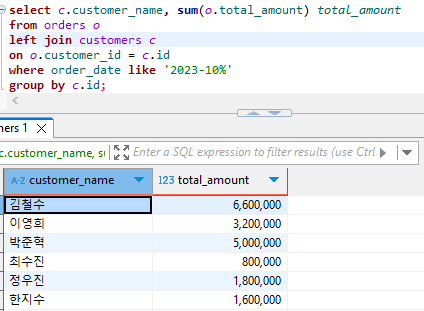 10. 2023년 10월에 주문한 고객의 이름과 주문 총액을 조회하세요.