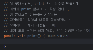 내가 작성하지 않아도 이 클래스를 이용하는 사람들이 알아서 내용을 오버라이드 해서 사용할 수 있게