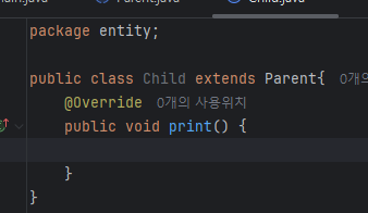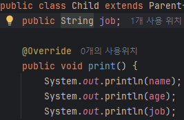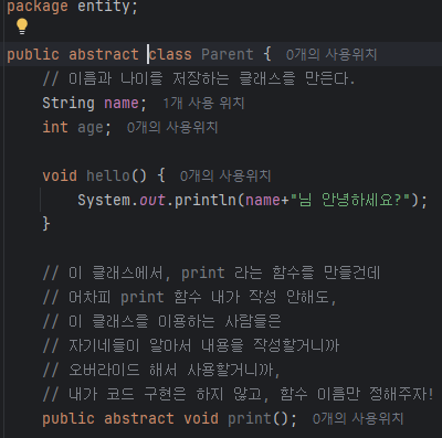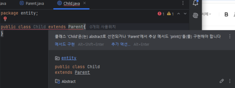 빨간줄이 뜨는 이유는 Parent에서 만든 print함수를 너가 까먹지 말고 꼭 만들어야된다고 알려주는것이다.