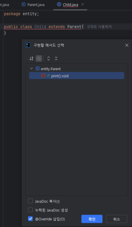 이제 Child 클래스를 만들건데 Parent 클래스를 상속받을거기 때문에