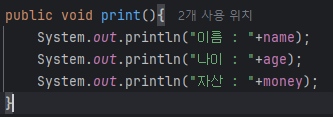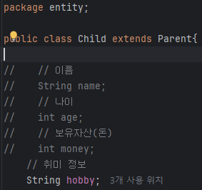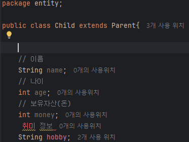여기서 멤버변수 중 이름, 나이, 보유자산이 앞에서 만든 Parent의 멤버변수와 겹친다.