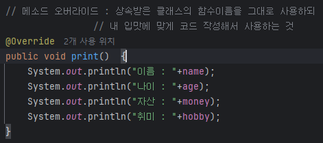 Child 클래스에서 Parent 를 상속받았기 때문에 함수 이름을 그대로 사용하면서 내 입맛에 맞게 사용할 수 있다.