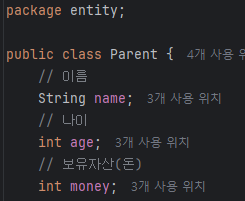 Parent 클래스에 이름, 나이, 보유자산 변수가 있기 때문에