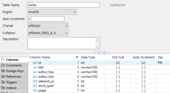 문자열 처리 실습 ● test6 데이터베이스에 books 테이블 생성하기Table Name: books- id : 제품 고유 ID (프라이머리 키, 자동 증가)- title : 책 제목 (문자열, 최대 100자)- author_fname : 저자의 퍼스트네임 (문자열, 최대 100자)- author_lname : 저자의 라스트네임 (문자열, 최대 100자)- released_year : 출판 연도 (정수형)- stock_quantity : 재고 수량 (정수형)- pages : 페이지 수 (정수형) ● books 테이블에 데이터 추가하기sql script를 새로 열어서 insert into 해서 데이터 입력INSERT INTO books (title, author_fname, author_lname..